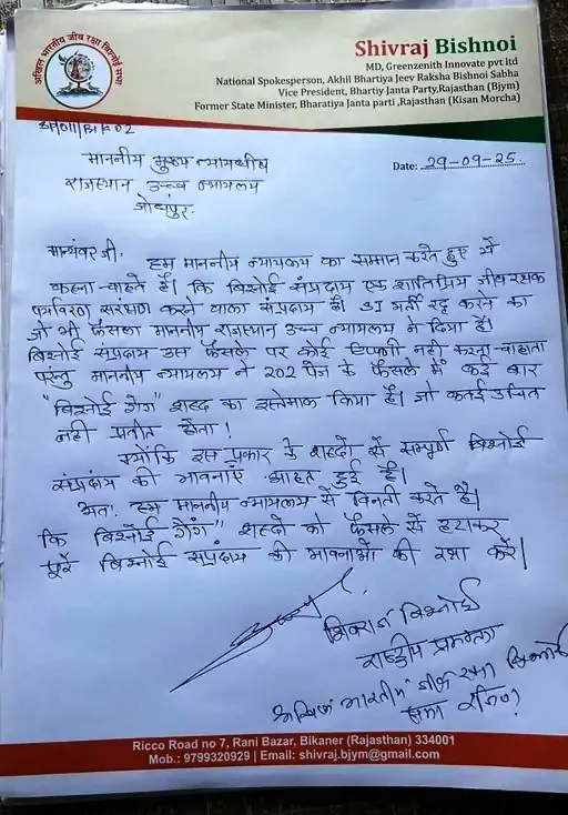 बीकानेर , 29 अगस्त। राजस्थान में सब-इंस्पेक्टर (SI) भर्ती परीक्षा को रद्द करने के जयपुर हाईकोर्ट के फैसले में ‘बिश्नोई गैंग’ शब्द के इस्तेमाल पर बिश्नोई समाज ने आपत्ति जताई है। अखिल भारतीय जीव रक्षा बिश्नोई सभा के राष्ट्रीय प्रवक्ता शिवराज बिश्नोई ने मांग की है कि इस शब्द को फैसले से हटाया जाए, क्योंकि यह पूरे समाज की भावनाओं को आहत करता है।