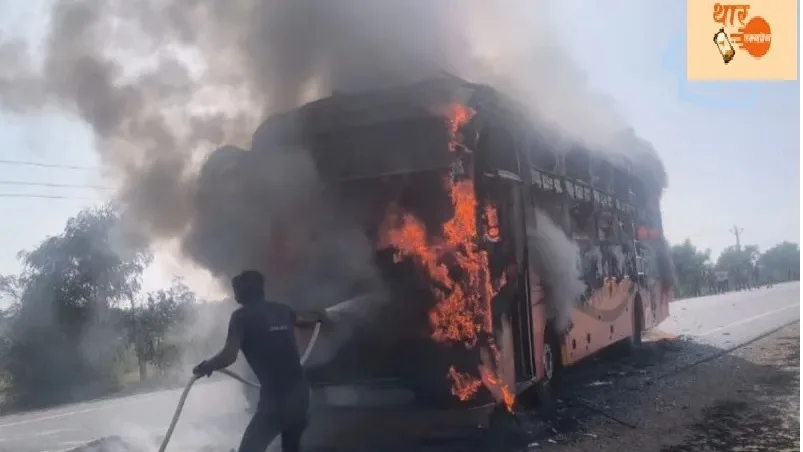 जैसलमेर से जोधपुर जा रही बस में 57 यात्री सवार थे। बस महज 10-15 किमी दूर थईयात गांव के पास वार म्यूजियम के निकट पहुंची ही थी कि पिछले हिस्से से धुआं निकला। शॉर्ट सर्किट या एसी कंप्रेसर फटने से आग लग गई, जो तेजी से फैल गई। चिकित्सा मंत्री गजेंद्र सिंह खींवसर ने बताया कि बस में केवल एक ही दरवाजा था, जबकि निकासी के लिए कम से कम दो होने चाहिए। सभी खिड़कियां लेमिनेटेड ग्लास से ढकी थीं, जिन्हें तोड़ा नहीं जा सका। स्लीपर बस की फाइबर बॉडी और पर्दों ने आग को और भयावह बना दिया। यात्री अंदर फंसकर जिंदा जल गए।