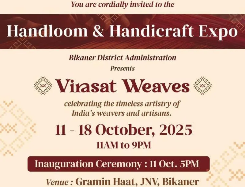बीकानेर, 9 अक्टूबर। दीपावली से ठीक पहले बीकानेर में देश के विभिन्न राज्यों के हैंडलूम और हैंडीक्राफ्ट कारीगरों का संगम होने जा रहा है। जिला प्रशासन और बीकानेर विकास प्राधिकरण (BDA) के संयुक्त तत्वावधान में 11 से 18 अक्टूबर तक जयनारायण व्यास कॉलोनी स्थित ग्रामीण हाट में हैंडलूम और हैंडीक्राफ्ट एक्सपो का आयोजन किया जाएगा।