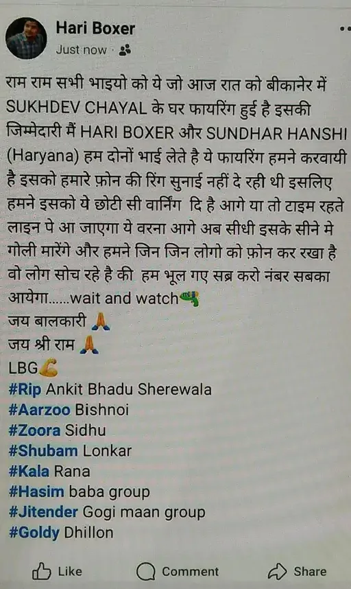 इस हमले की जिम्मेदारी लॉरेंस गैंग के गैंगस्टर हैरी बॉक्सर ने सोशल मीडिया पर ली है। उसने अपनी पोस्ट में लिखा, “ये फायरिंग हमने करवाई है। इसको हमारे फोन की रिंग सुनाई नहीं दे रही थी, इसलिए हमने ये छोटी सी वॉर्निंग दी है। आगे टाइम रहते लाइन पर आ जाएगा, वरना अब सीधे सीने में गोली मारेंगे।” इस पोस्ट ने इलाके में दहशत और बढ़ा दी है।