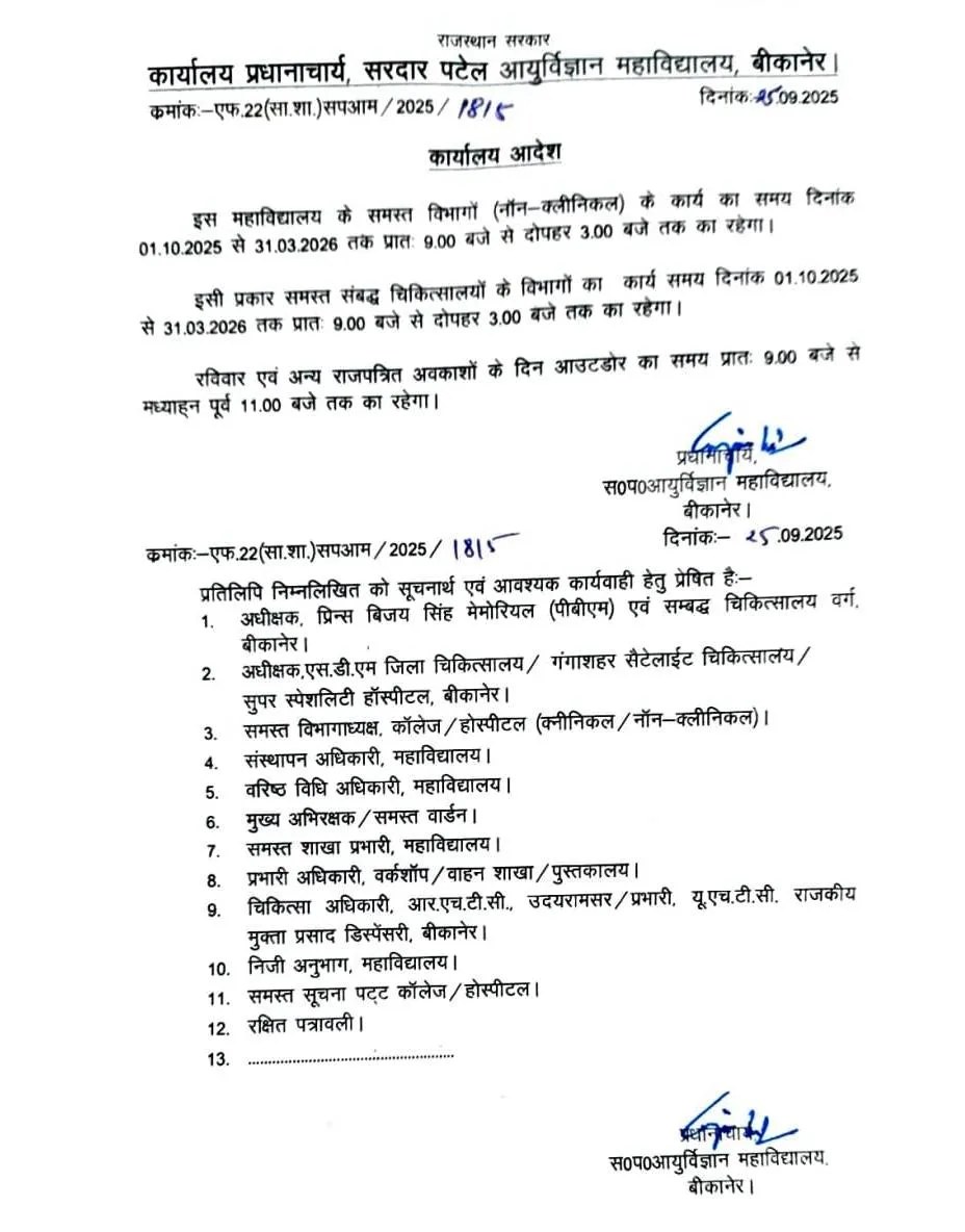बीकानेर के सरदार पटेल मेडिकल कॉलेज के प्राचार्य गुंजन सोनी ने समय परिवर्तन के आदेश जारी किये
