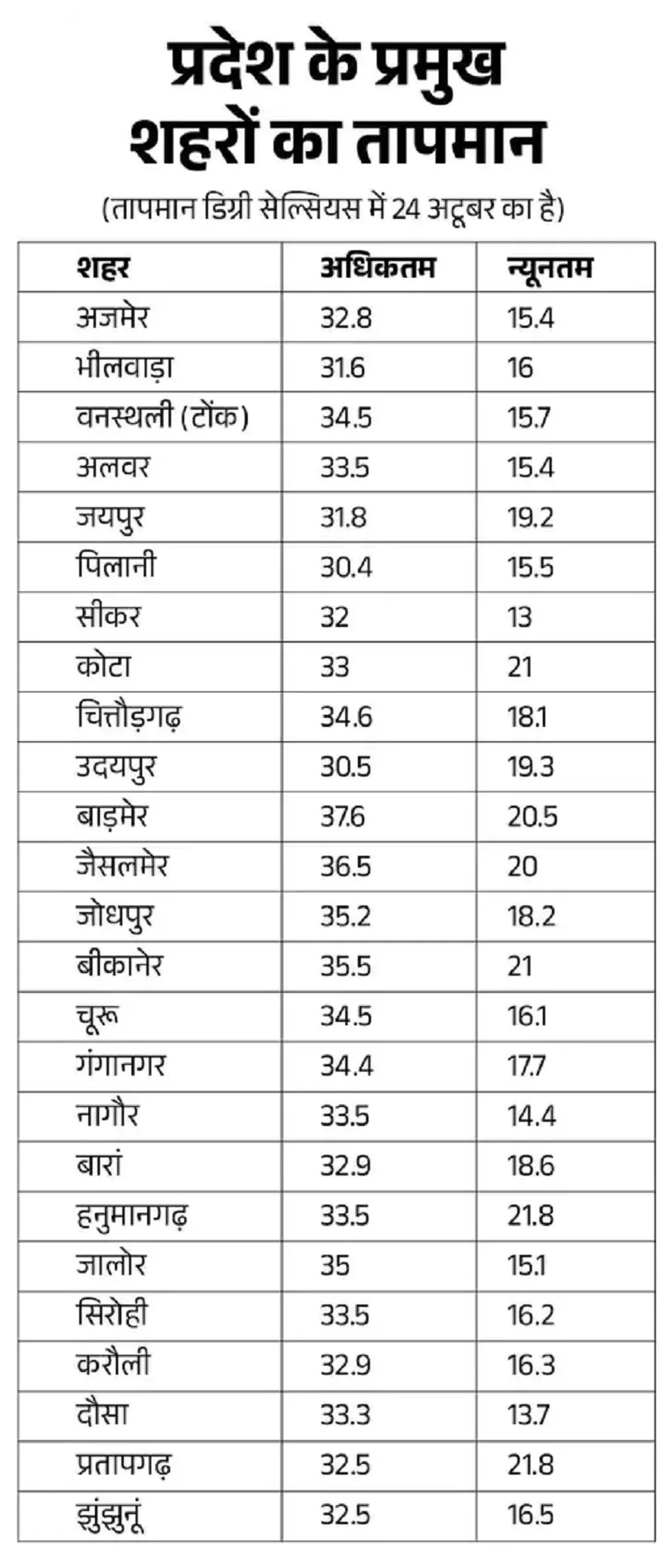 पिछले 24 घंटों के दौरान दिन में तेज धूप रहने के कारण भले ही सर्दी का अहसास कम रहा, लेकिन रात में तापमान गिरने से ठंडक बढ़ गई है। कल सबसे ज्यादा सर्दी सीकर (न्यूनतम तापमान 13 डिग्री सेल्सियस) और दौसा (न्यूनतम तापमान 13.7 डिग्री सेल्सियस) में रही। नागौर में न्यूनतम तापमान 14.4 और जयपुर में 19.2 डिग्री सेल्सियस दर्ज हुआ। अधिकतम तापमान की बात करें तो बाड़मेर में 37.6 डिग्री, जैसलमेर में 36.5 डिग्री और बीकानेर में 35.5 डिग्री सेल्सियस तापमान दर्ज हुआ। रातों में सर्दी बढ़ रही है। कल (24 अक्टूबर) दौसा में न्यूनतम तापमान 13.7°C, सीकर में 13°C, नागौर में 14.4°C, और जयपुर में 19.2°C दर्ज हुआ। दौसा और सीकर में 14°C से नीचे गिरावट सबसे अधिक रही। अधिकतम तापमान: बाड़मेर 37.6°C, जैसलमेर 36.5°C, बीकानेर 35.5°C। दिन में धूप रही, लेकिन रात ठंडी।